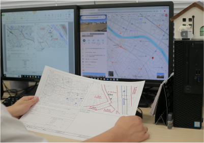 ポラスグループが手掛ける物件ごとに、工事現場までの案内図を作成する業務です。大工、職人、建材メーカーの方々が、円滑に現場へ到着できるようサポートする役割を担っています。