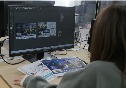 分譲物件の営業支援ツールの企画・制作に従事。営業担当者が顧客へスムーズな提案を行えるよう、物件ごとのセールスポイントを整理したストーリー構成(ページ構成)を立案し、視覚的なレイアウトデザインへと落とし込む業務を行います。